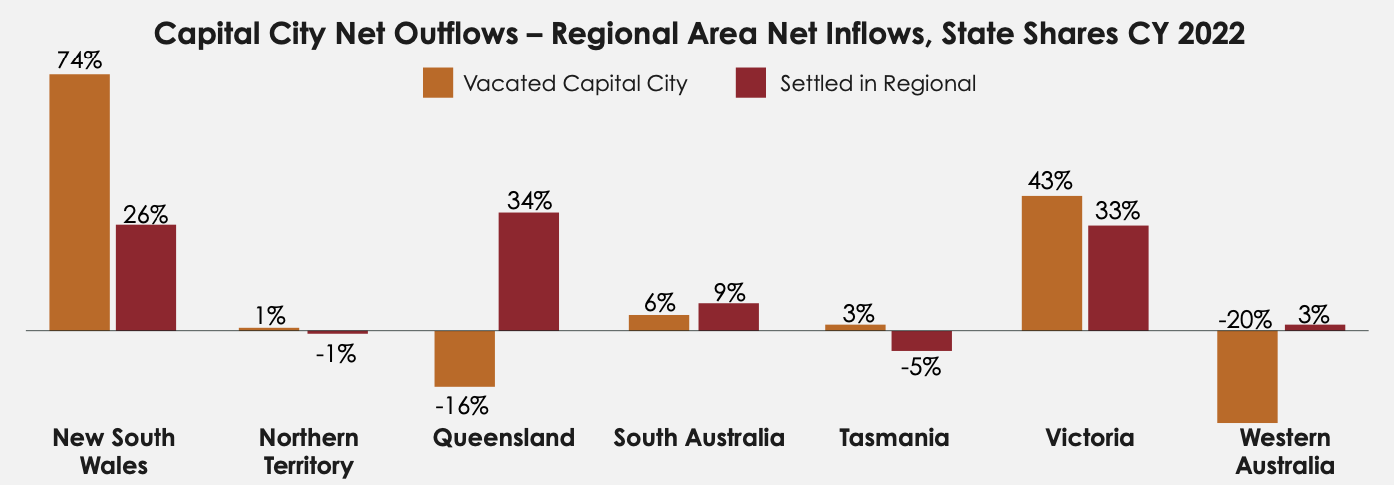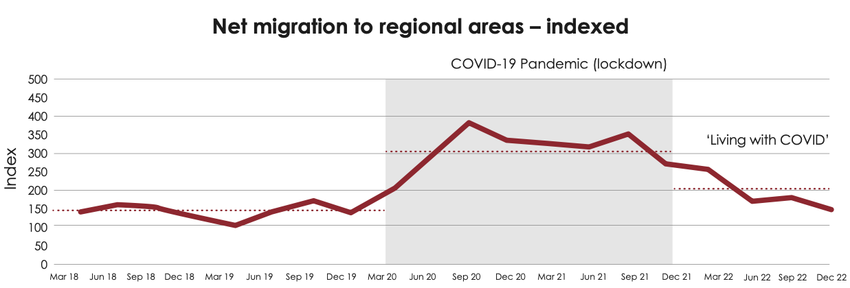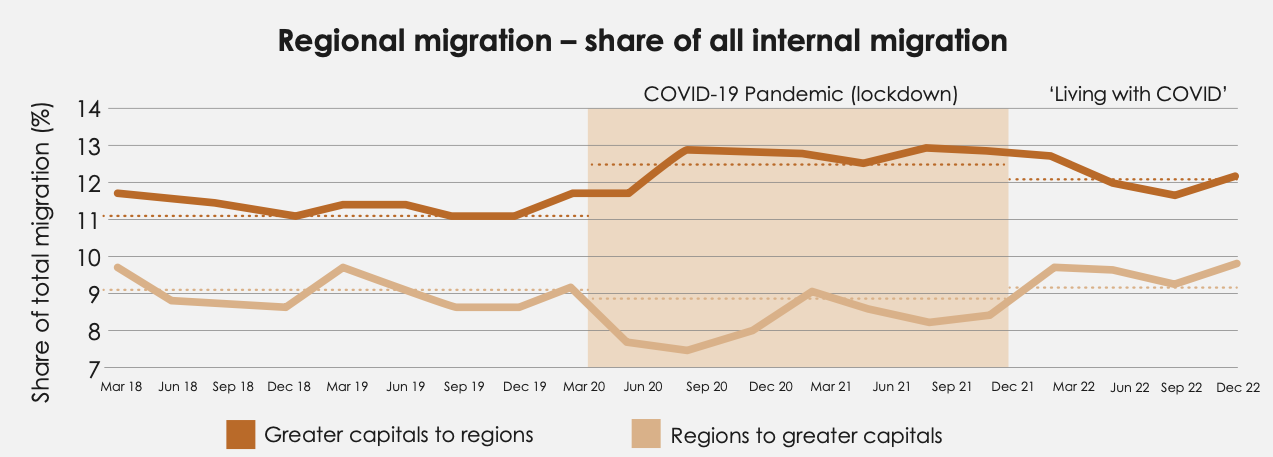 One year into the post-pandemic era, the population flow from capital cities to the regions has remained elevated, as shown in the chart below.