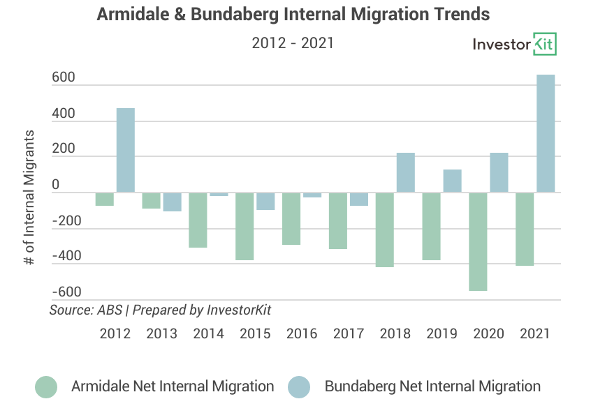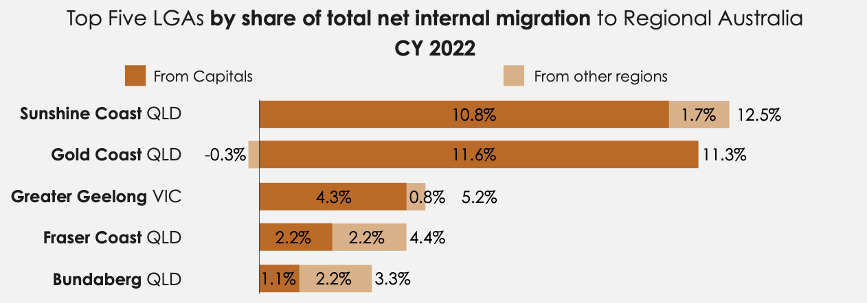 In comparison, the Queensland city Bundaberg has been much more of an internal migration winner in recent years. It has been receiving a positive number of internal migrants for five years and became the no.5 largest net internal migration gainer in 2022.