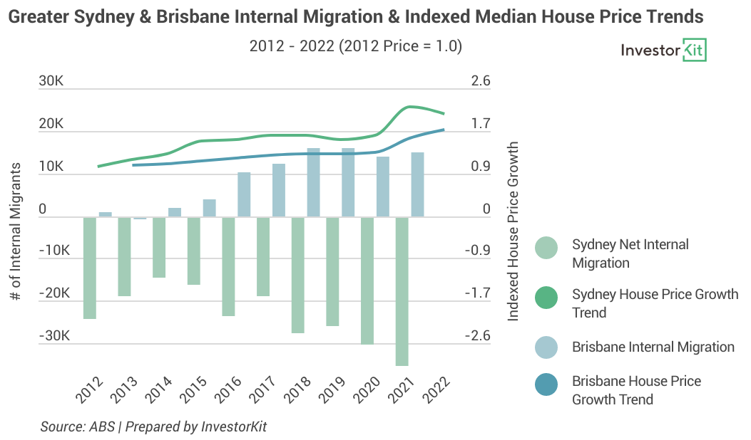 In contrast, Greater Brisbane has been a big winner of internal migrants, receiving an increasing number of internal migrants over the past decade. Still, its house prices only achieved circa 75% 10y growth, much lower than Sydney’s.