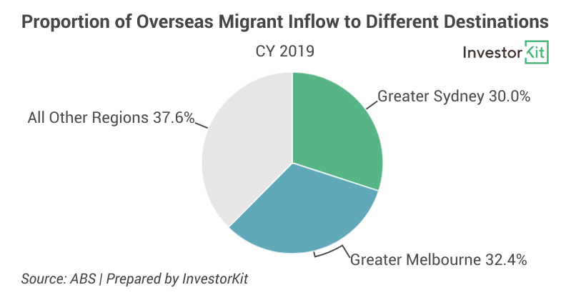 Sydney is one of the two major immigrant destinations in Australia, receiving close to one-third of all overseas migrants every year before the COVID disturbance (below chart). The incoming immigrants make sure of Sydney’s population growth and keep the city’s housing demand high, pushing housing prices to grow.