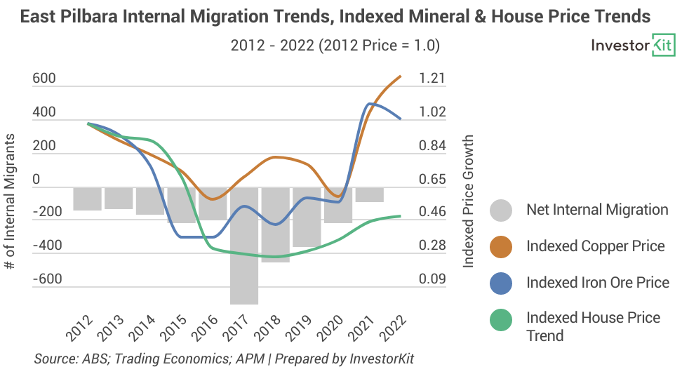When mineral prices dropped significantly in the mid-2010s, East Pilbara’s experienced a sharp increase in resident outflow, and its median house price followed and declined steeply as well (below chart).