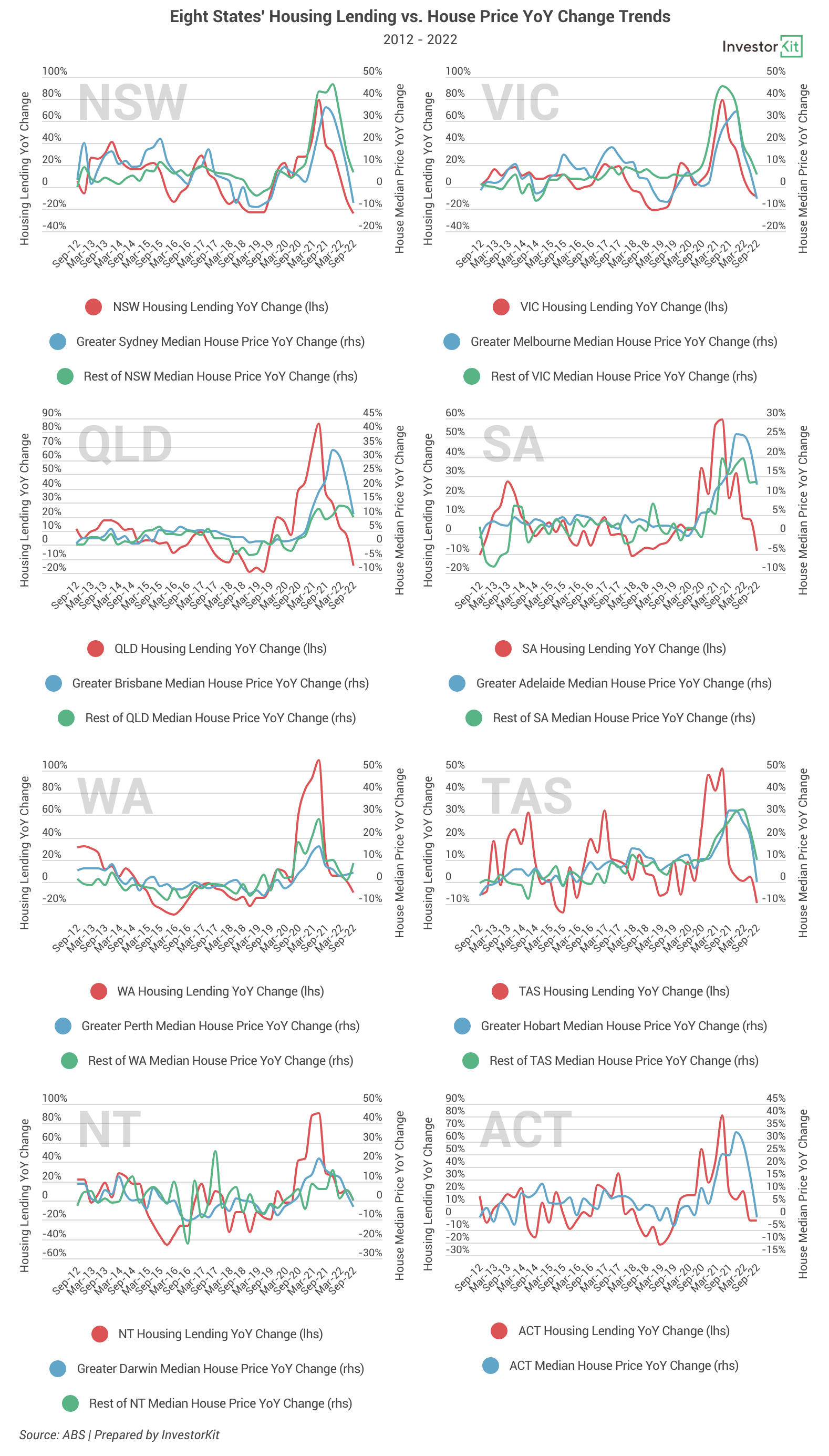 We see that lending and price trends correlate with each other in many cases, with time lags varying from 0 months (eg. regional NSW 2019-21; WA 2020-22) to 9-12 months (eg. TAS 2013-15 & 2020-22).