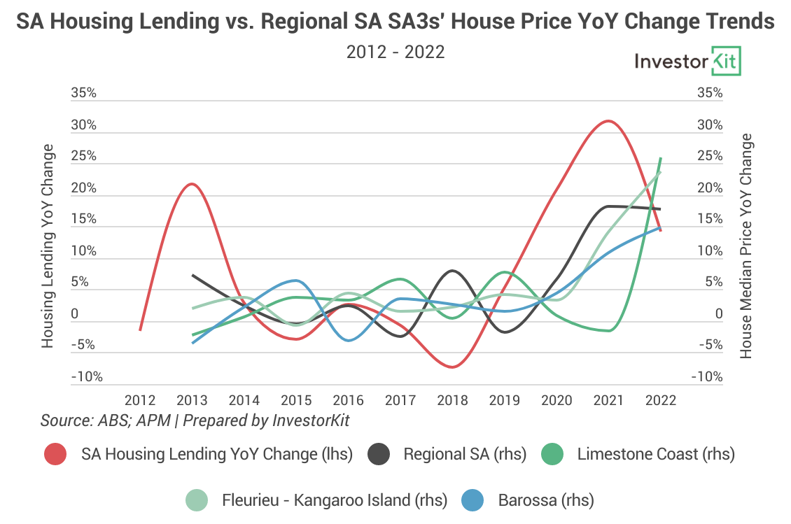 The three regions each have their distinctive industrial structure, economic activity, population growth pattern, housing supply level, etc. That’s why their price growth trends differ from regional SA’s average trendline and react much differently to the lending trendline.