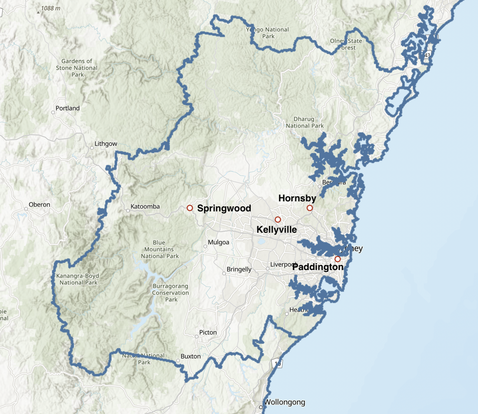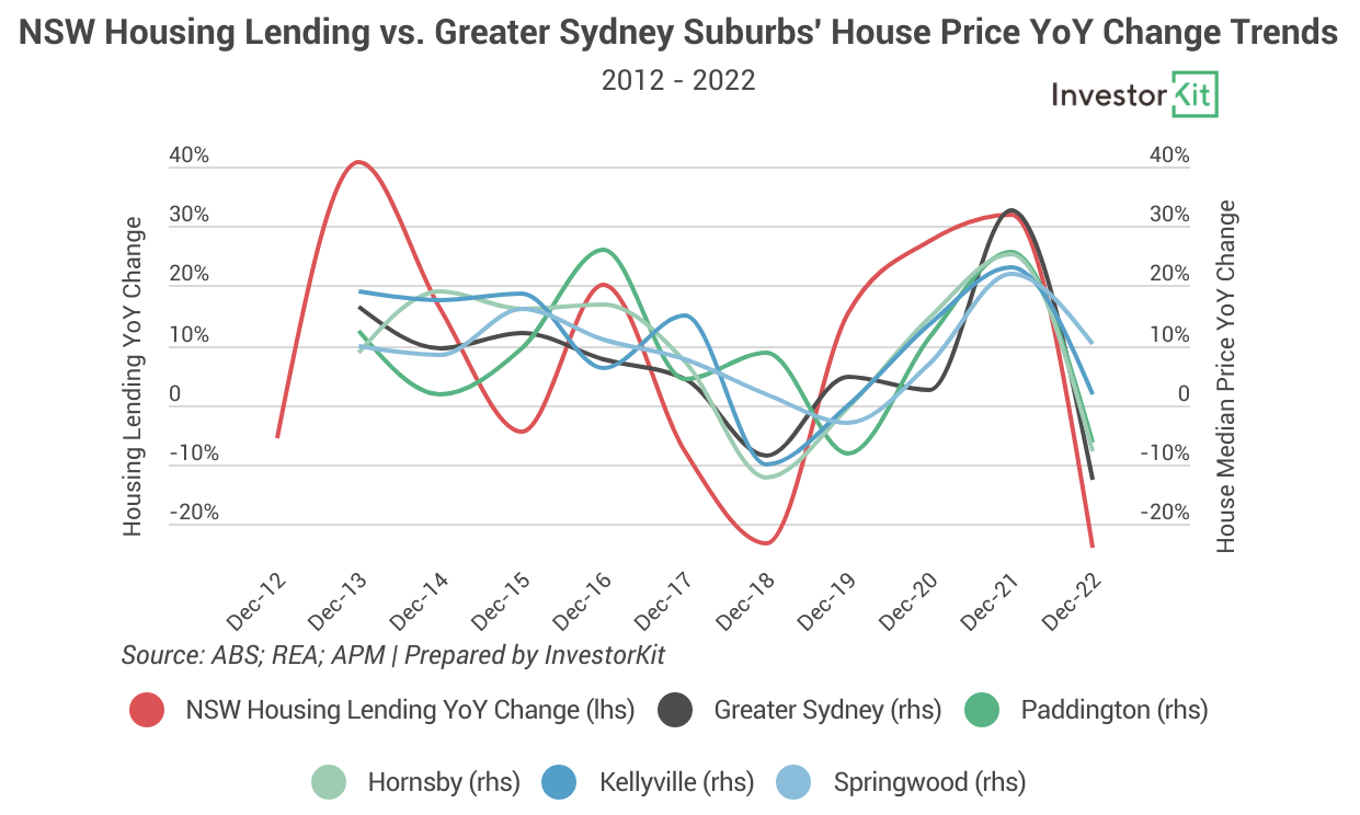 The above chart shows the state’s housing lending year-on-year change trend and four suburbs’ median house price YoY growth rates over the past decade. The four suburbs are shown in the map below.