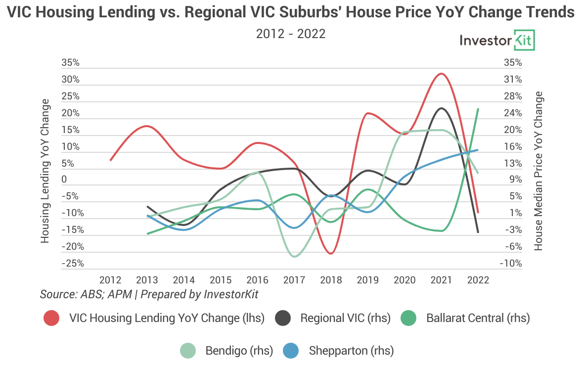 We have three regional Victorian suburbs here: Ballarat, Bendigo and Shepparton, as shown in the above map. The below chart shows the state’s housing lending year-on-year change trend and three suburbs’ median house price YoY growth rates over the past decade.