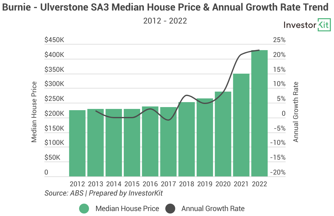 Burnie - House prices didn’t achieve much growth in the 2010s until 2018 (below chart). InvestorKit entered the market in 2017 and achieved circa 90% growth in our clients’ asset value in 5 years.