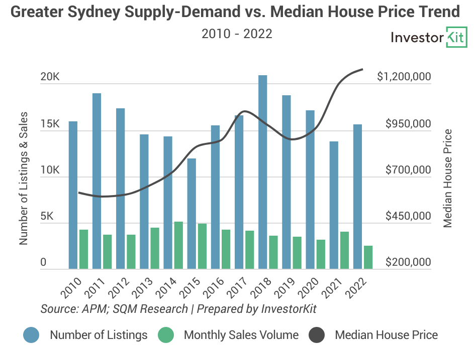 • Greater Sydney’s house supply (number of listings) started declining 2 years before the 2013 bounce, while the level of demand (sales volume) started increasing at around the same time.
