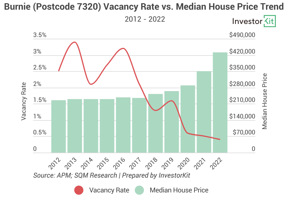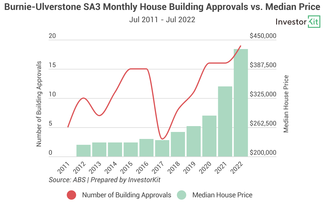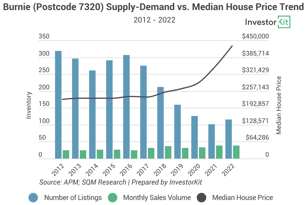 • Burnie’s house supply level started decreasing steadily in 2017 (a year before the bounce) while demand was increasing. The decline lasted for 5 years, adding more and more pressure to the market, which led to robust price growth in the house market.