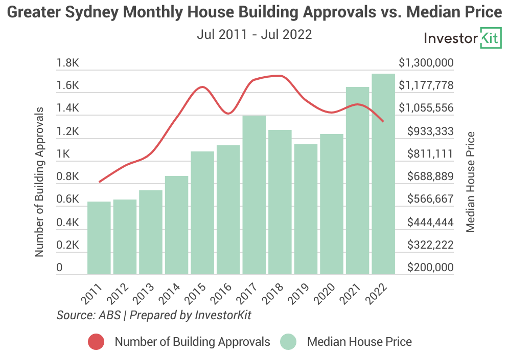 • Greater Sydney’s building approval numbers were relatively low before its 2013 bounce and surged as house prices grew. The 2016 and 2019 building approval declines were also followed by price jumps.